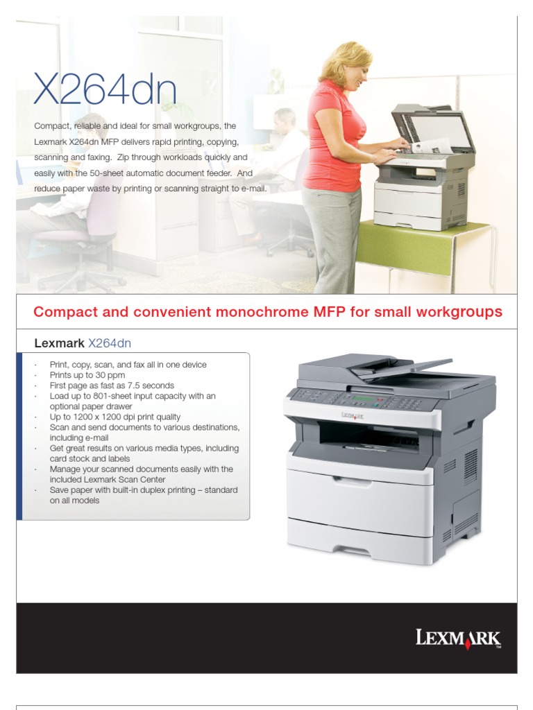 Compact, reliable and ideal for small workgroups, the Lexmark X264dn MFP delivers rapid printing, copying, scanning and faxing - with output speeds up to 30 ppm .