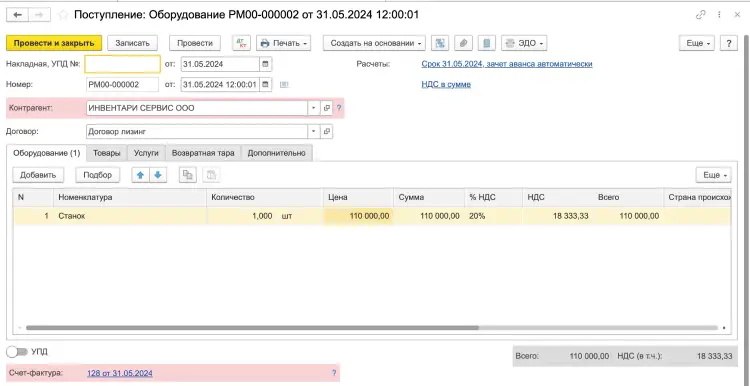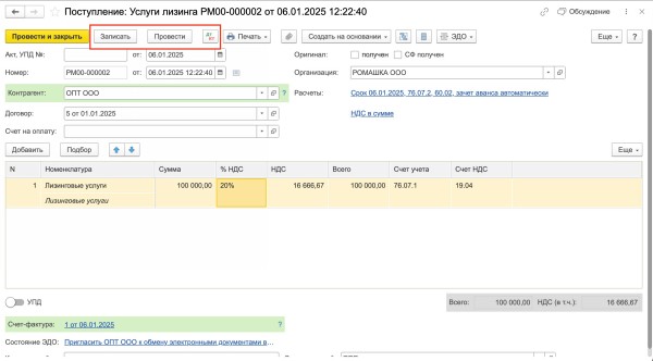 Принятие к учету лизинга в 1с 8.3