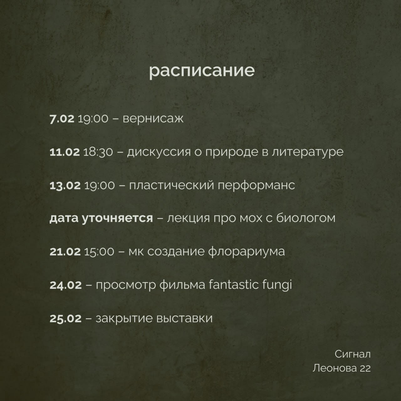 В ее идее заложено проживание природы через разные уровни восприятия: тактильный, интеллектуальный, чувственный. Поэтому предлагаем познакомиться с внутренним расписанием — мы постарались сформировать его так, чтобы опыт взаимодействия с природой получился многогранным. Пока что делимся кратко тем, что будет, чтобы вы могли зафиксировать для себя интересующие события. Более детальные анонсы с регистрациями будут выходить постепенно.