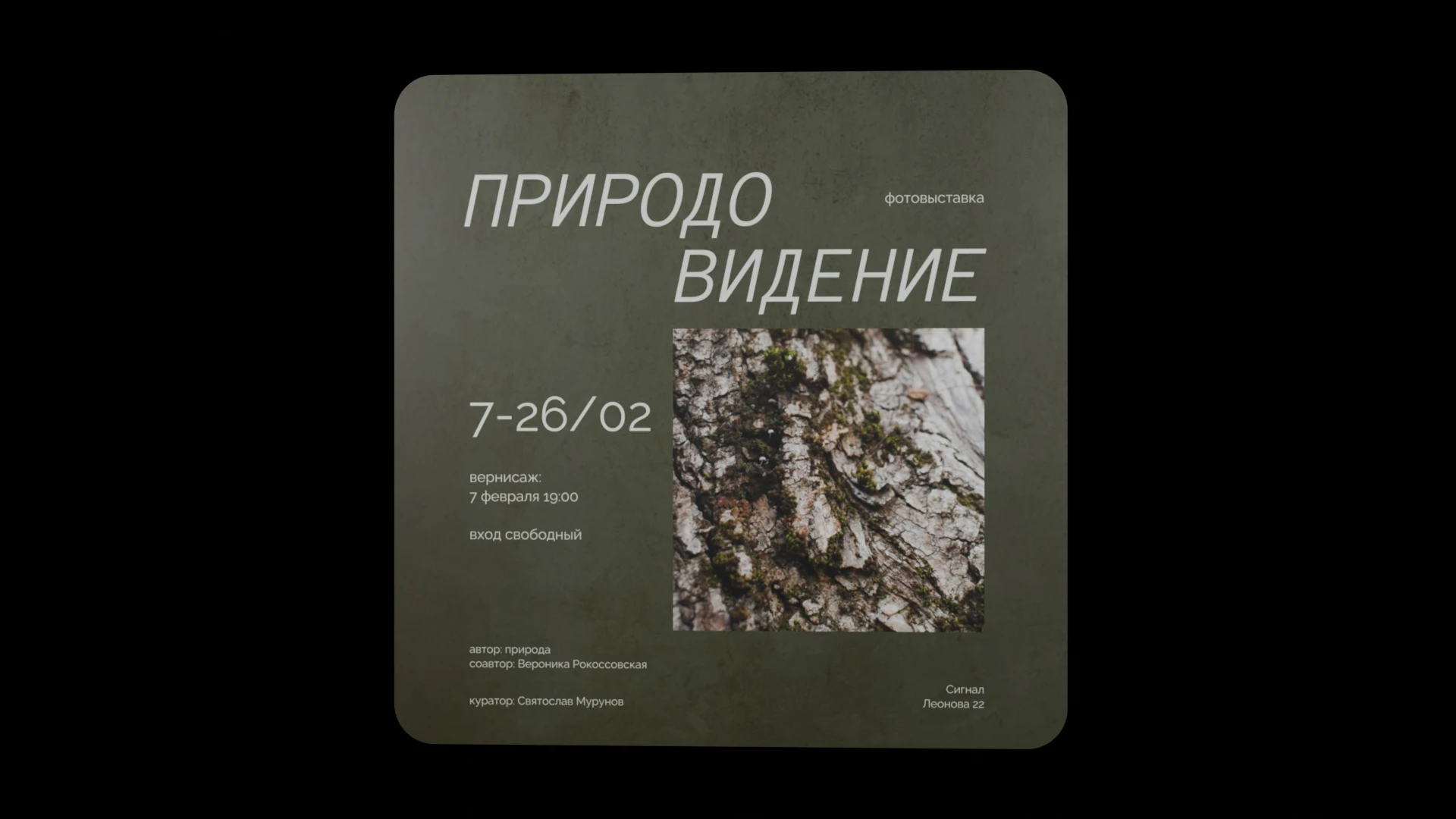 Выставка Природовидение, фотографии природы и её зеленых покровов, соавтор Вероника Рокоссовская, куратор Святослав Мурунов, вход свободный.