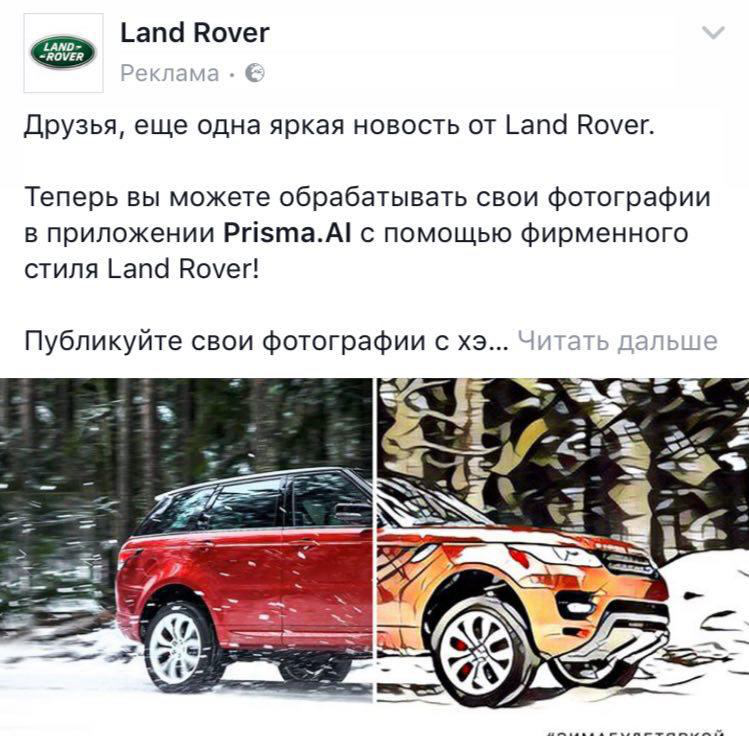 Land Rover совместно с Prisma запустили собственный фирменный стиль для обработки фотографий. Судя по комментариям, пользователям новый фильтр пришелся по душе: https://goo.gl/s8wdCB