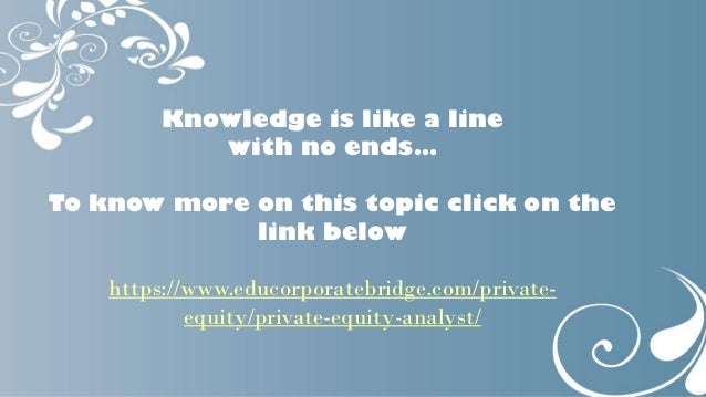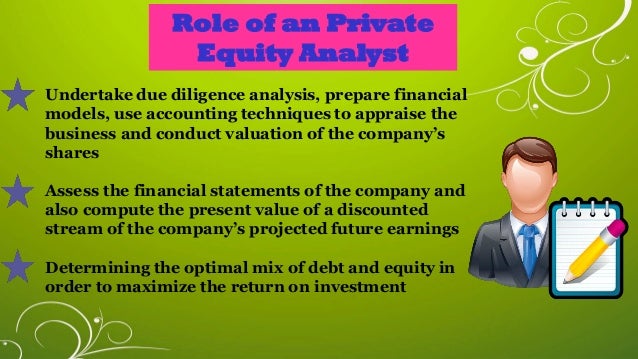 03.03.2016 · A Private Equity Analyst or PE Analyst is a person who works primarily for the private equity firms and conducts research, ratio analysis, and gives interpretations on private companies. Use due diligence, financial modeling techniques, and valuation methods to assess the advantages of investing in a private company.