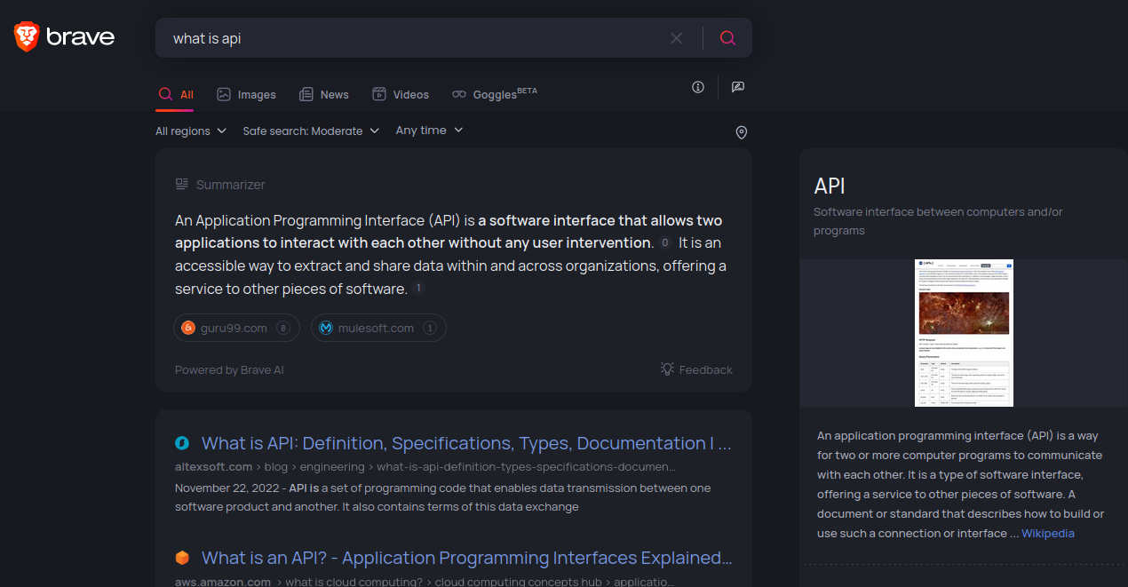 Brave может составить конкуренцию поисковым гигантам. Выводит быстрые ответы и карточки, где возможно. Одна из интересных функций — сумматор на основе искусственного интеллекта. Если вы ищете какой-либо ответ на вопрос, то поисковик соберёт информацию из нескольких сайтов в один абзац, чтобы меньше приходилось искать по сайтам. Поддерживаются !Bangs как в DuckDuckGo.