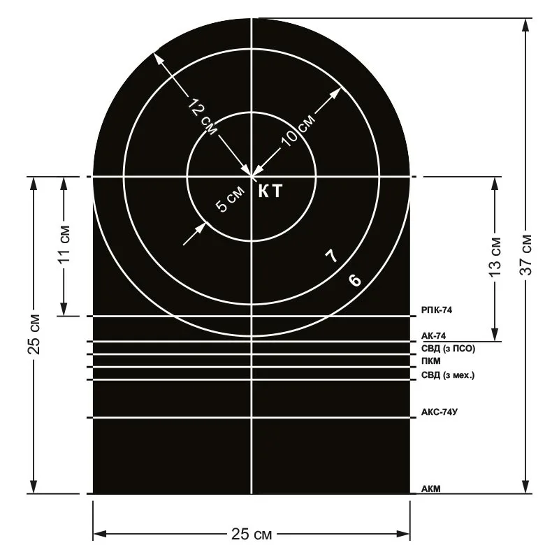 Стрельба ведется по проверочной мишени (или по черному прямоугольнику размером 35 см по высоте и 25 см по ширине), укрепленной на белом щите высотой 1 м и шириной 0,5 м.