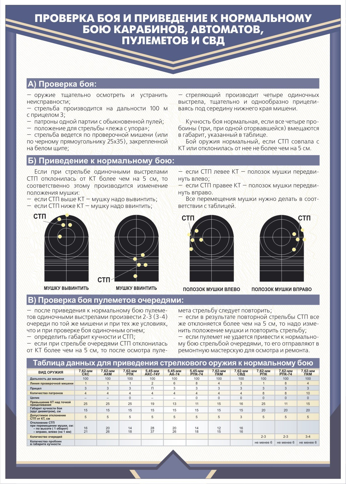 Приведение оружия к нормальному бою - совмещение средней точки попаданий (СТП) с точкой прицеливания (ТП) при стрельбе на разных дистанциях и в разных условиях – в этом главное отличие пристрелки от приведения оружия к нормальному бою.