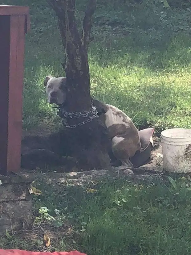 Привязанная к дереву собака, без возможности подняться . . .