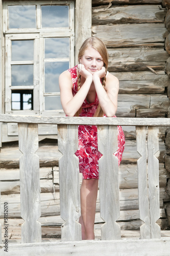 Вот девочка у колодца, рядом с ней – привязанная верёвкой к брёвнам . На крыльце деревянной избы стоит, подбоченясь, босоногая девочка . Над ней .