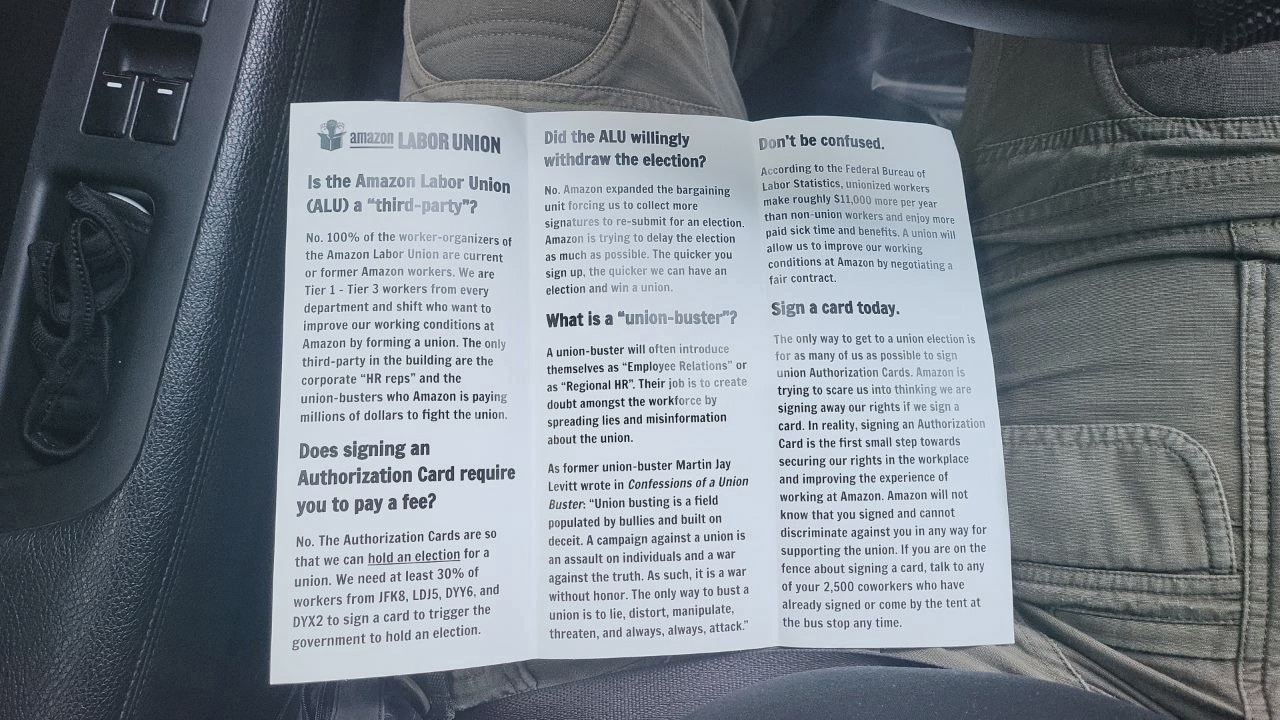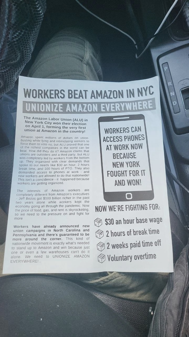 Снова вести из Сиэтла. Проезжал я на днях возле склада Amazon и внезапно вижу троих ребят, бойко раздающих листовки. Товарищей прямо на моих глазах стали выгонять охранники, но мне хватило времени, чтобы разговориться с ними и набрать профсоюзных буклетов.