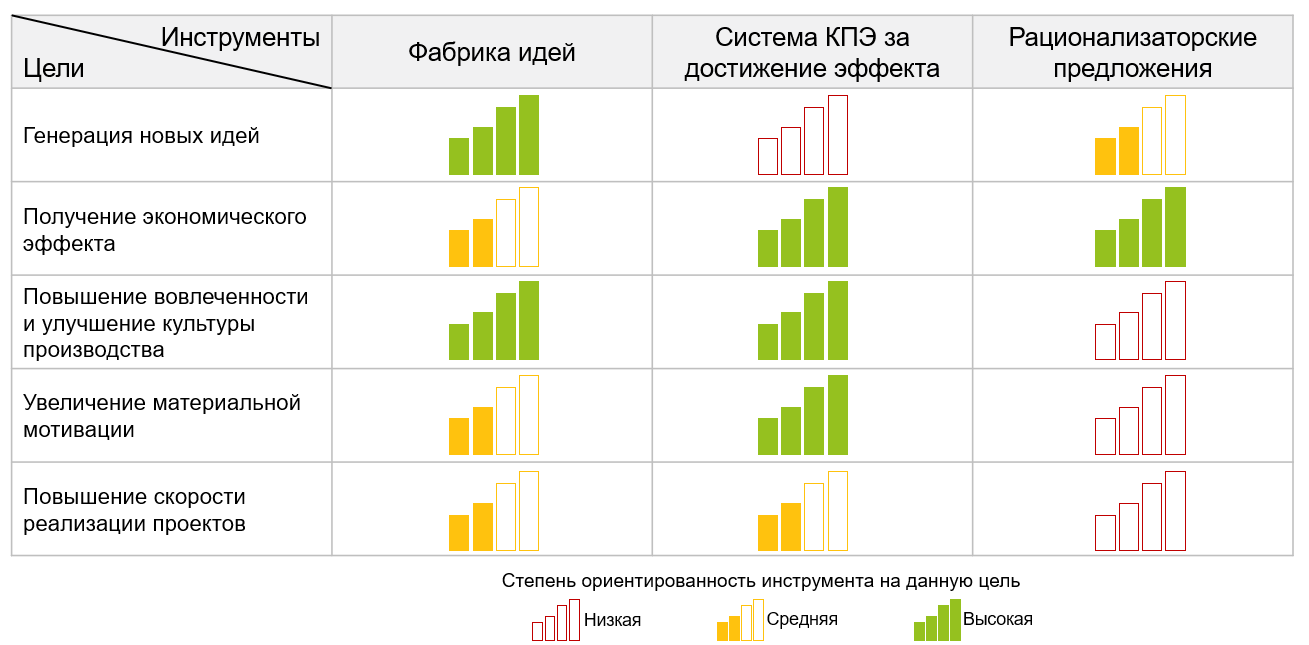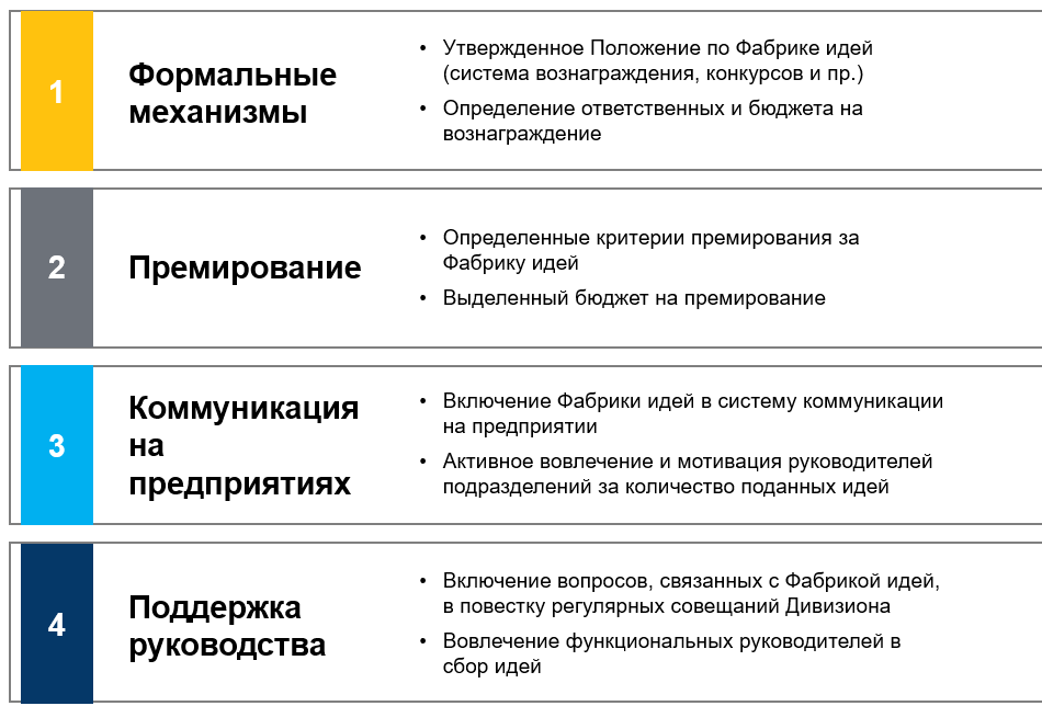 - Систему мотивации, привязанную к подаче идей
