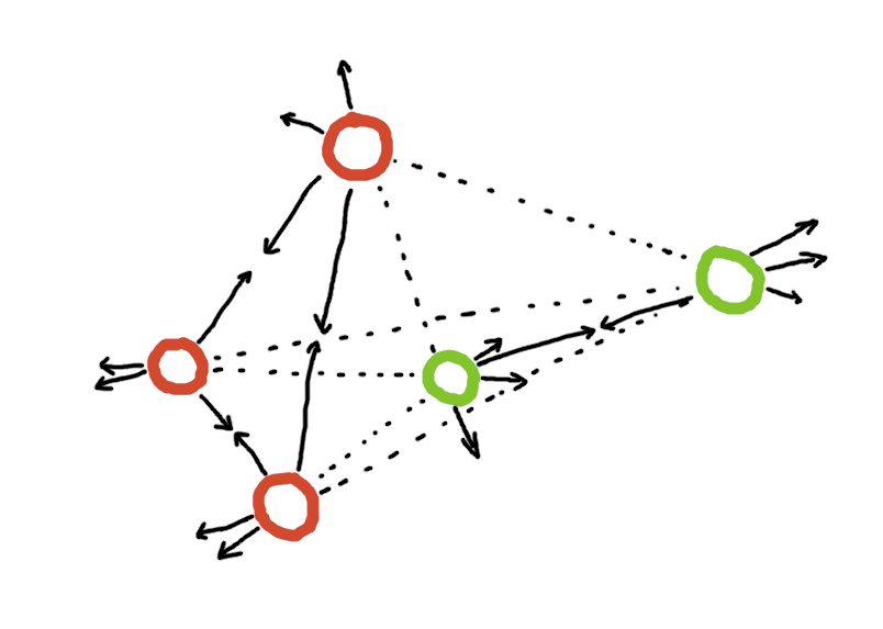 Рассмотрим несколько объектов разных категорий (здесь зелёные и красные). Мы хотим сделать генератор эмбеддингов для объектов, такой, чтобы по выбранной метрике объекты одной категории лежали близко, а объекты разных категорий — далеко. Строго говоря, это не совсем корректное определение метрик-лёрнинга, но наиболее понятное и вполне валидное на практике*.