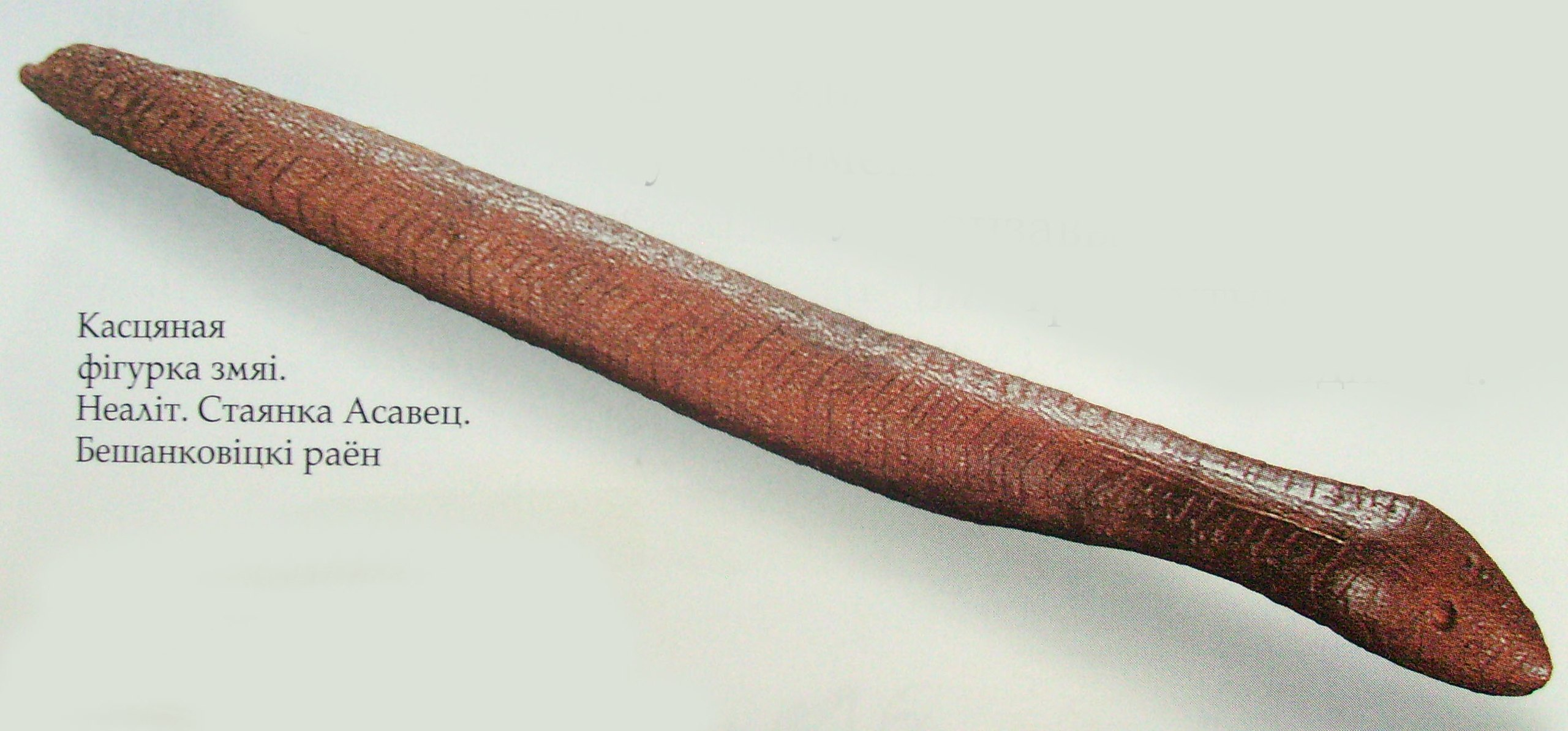 На этой же стоянке в восьмидесятые отыскали такую же змейку, только уже целую, а не фрагмент. Стоянка Осовец-2 относится к Северобелорусской археологической культуре. Эта археологическая культура появилась на основе местной доиндоевропейской усвятской культуры, но испытала громадное влияние верхнеднепровской и среднеднепровской культур, которые были уже индоевропейскими. Влияние было настолько сильным, что часть археологов считает Северобелорусскую культуру локальным вариантом культуры боевых топоров.