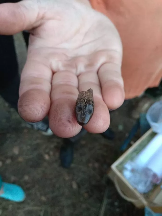 Поэтому поговорим про совсем уж первобытные времена. Вот, например, обломок амулета в форме ужиной головы из поселения Осовец-2 Бешенковичского района. Поселение относится к периоду среднего и позднего палеолита, а также бронзового века. По словам археолога Максима Чернявского, эта находка датируется III тысячелетием до нашей эры.