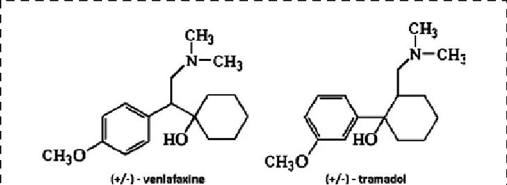 Венлафаксин — первый на рынке антидепрессант двойного действия из группы Селективных Ингибиторов Обратного Захвата Серотонина и Норадреналина (Serotonin–Norepinephrine Reuptake Inhibitor), структурно и частично фармакологически сходный с трамадолом (венлафаксин не имеет значимых опиоидных эффектов, оба SNRI), является бициклическим производным фенилэтиламина.