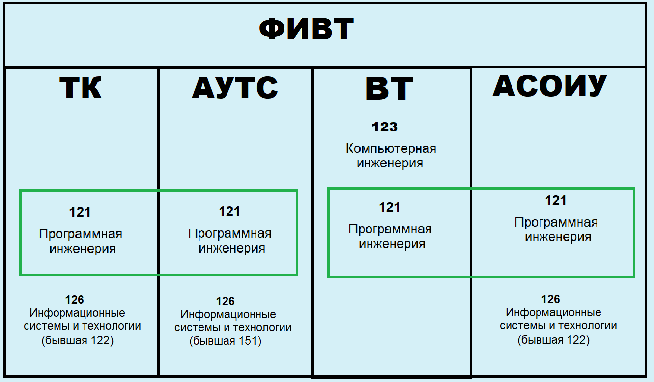 Даже одна и та же специальность на разных кафедрах очень отличается. Исключения составляют зеленые квадраты. Там по многим предметам у вас будут одни и те же преподаватели. Подробнее про кафедры можно узнать тут: ТК, АСОИУ, ВТ, АУТС. Но коротко говоря АУТС и ТК это более лайтовые кафедры, а на ВТ и АСОИУ вам продохнуть не дадут от матана и всего сопутствующего. После первых двух лет линейка вам будет в кошмарах сниться.