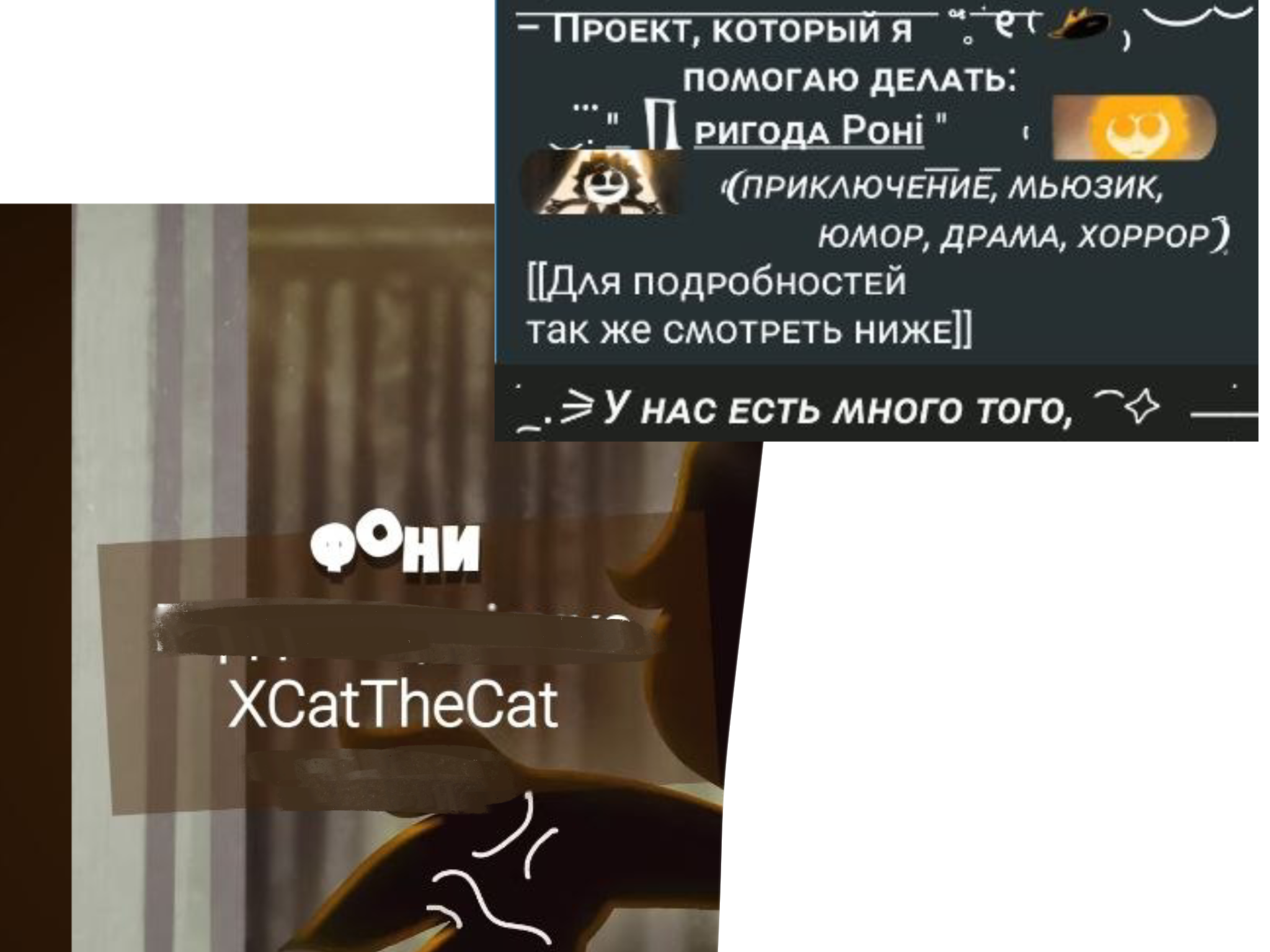 Я спостерігав Xcat the Cat активними у групі,та вирішив заглянути до їх тгк,й в закріплених повідомленнях побачив що вони таки допомагають з Пригодою Роні,а точніше,з бекграундом та ілюстраціями.