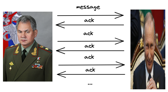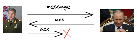 Что же надо сделать, чтобы избежать такого исхода? Всё просто с первого взгляда. Давайте пошлём гонца обратно, и пусть он сообщит о том, что доставил своё сообщение, тогда путаницы не будет, верно же?