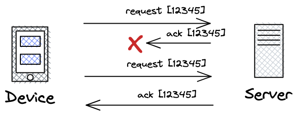 И вот как решили эту проблему. Запросы действительно перепосылаются клиентом, если не было получено подтверждение, НО к запросу добавляется специальный айдишник, который сервер кеширует. И если пришёл запрос с айдишником, который уже был замечен ранее, сервер просто отдаёт закешированный ответ, не делая никакой реальной работы.