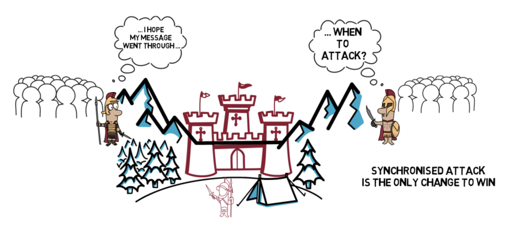 Представим ситуацию: есть 2 генерала, которые планируют напасть на город и находятся на расстоянии друг от друга. Им нужно договориться о совместном нападении так, чтобы они напали одновременно, иначе ничего не получится и армии просто проиграют.