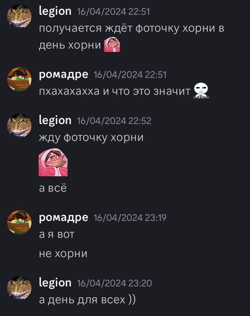 16.04.2024 года в мире праздновался неофициальный день Хорни и я решила поделится этим в чате, чтобы посмеяться, шуточно друг друга поздравить и тд. И после стрима я получаю подобное сообщение: