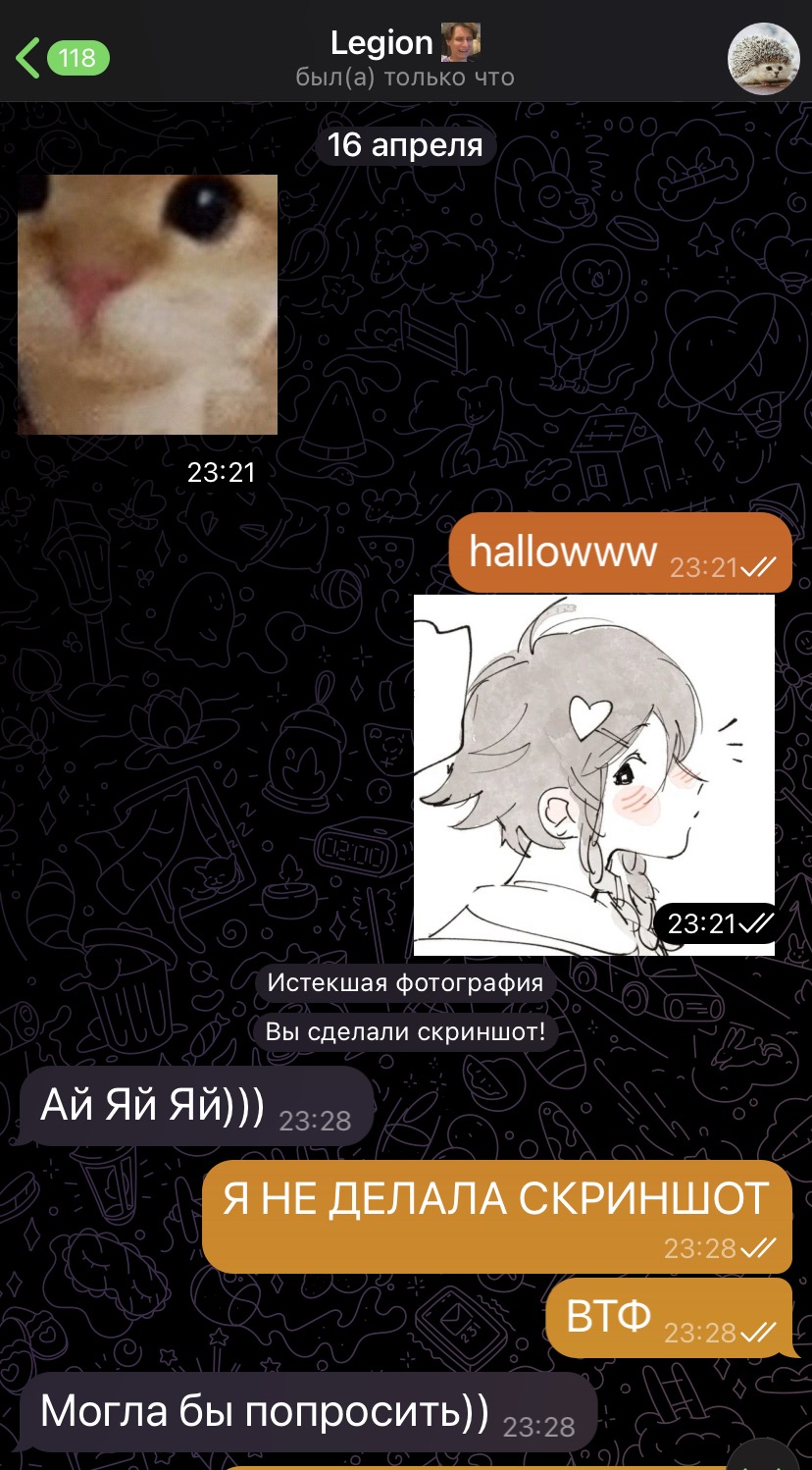 На фото не было чего-то СВЕРХ страшного, но сам факт подобной выходки остался со мной на некоторое время. Это просто показалось странным, смущающим и пугающим для меня, как для человека, пережившего фото недетского характера в довольно раннем возрасте, о чем я и оповестила Легиона: