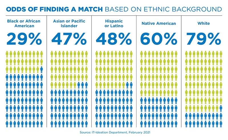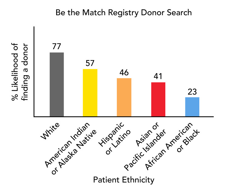 В США у расовых меньшинств гораздо меньше шансов найти подходящего донора стволовых клеток крови, нежели у белых американцев (рис. 1). Пациенты с большей вероятностью найдут совпадение стволовых клеток от доноров аналогичной этнической принадлежности, и гораздо меньше небелых американцев зарегистрировались в качестве возможных доноров в реестре Be The Match, национальной программы доноров костного мозга (NMDP) (рис. 2).