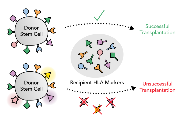 Конкретные белки, которые отображаются в клетках крови человека, определяются его генетическим составом. Эти белки называют маркерами лейкоцитарного антигена человека (HLA). Для пациентов с лейкемией, таких как Вирай, это означает, что для того, чтобы обманом заставить иммунную систему принять донорские стволовые клетки, донор должен иметь маркеры HLA, очень похожие на их собственные (рис. 3).