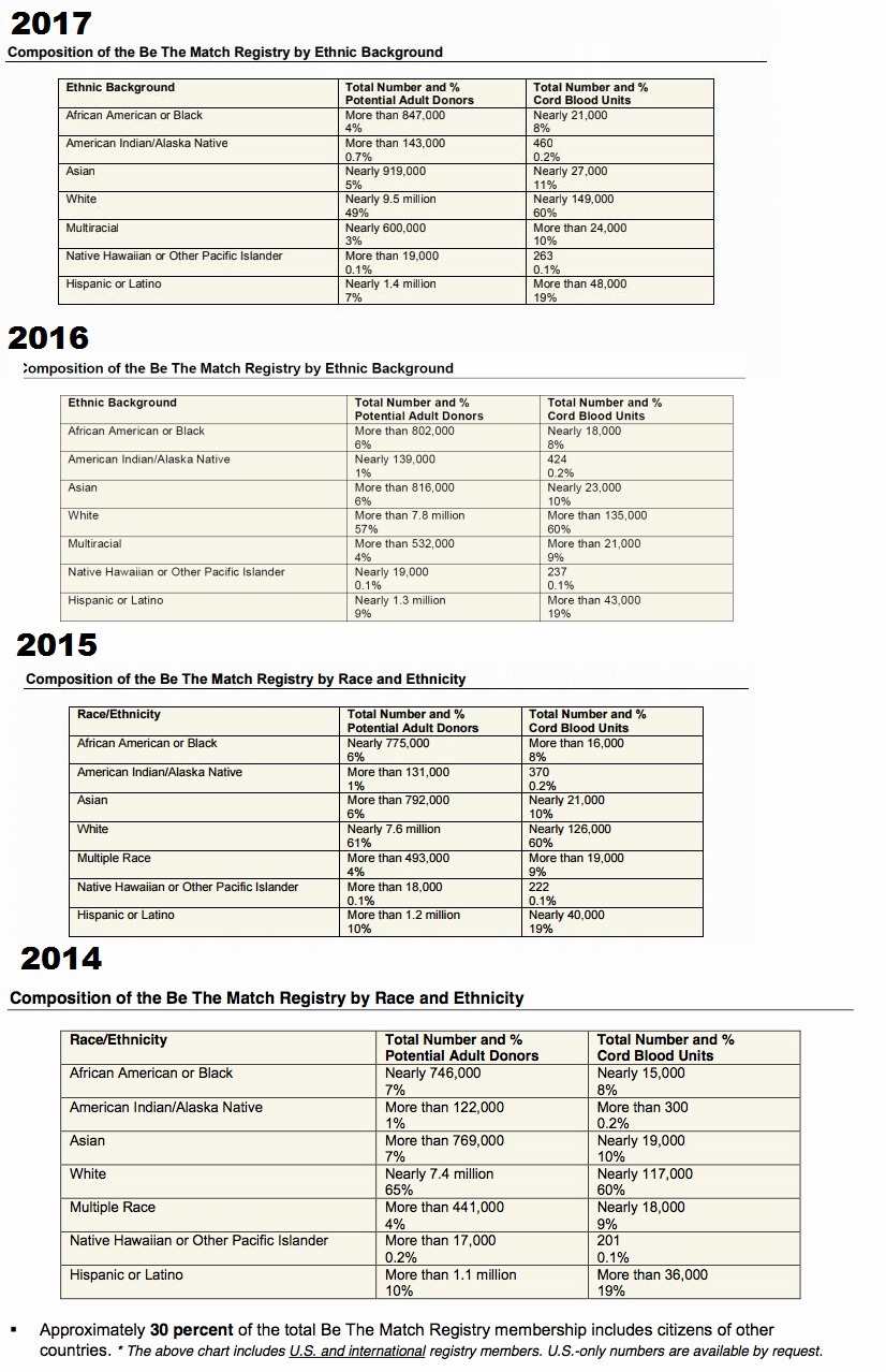 > В национальном американском регистре Be The Match в целом 30% доноров являются меньшинствами и 3% потенциальных доноров самоопределяют себя как расово-смешанных. Хотя это примерно соответствует данным переписи населения США, необходимо больше доноров смешанной расы, учитывая огромное генетическое разнообразие группы.
