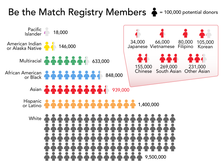 Таким образом, лучший вариант донора для Вирай - это другой человек филиппинского происхождения. Однако только 0,5% национального реестра составляют американцы филиппинского происхождения (рис. 2). У людей со смешанным расовым происхождением шансы еще более сомнительны. И хотя члены семьи являются очевидным кандидатом для любого пациента, ищущего донора, Be the Match сообщает, что только 30% пациентов находят подходящего донора среди своих родственников.