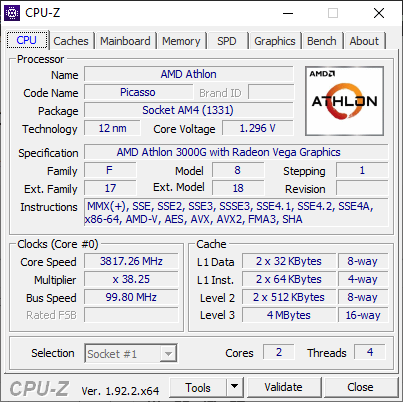 Хотя AMD однозначно говорит о процессоре Raven Ridge, большинство утилит определяют Athlon 3000G как процессор Picasso . В результате ядра вместо ядер Zen+ и 12-нм техпроцесса мы получаем старые ядра Zen и 14-нм техпроцесс .