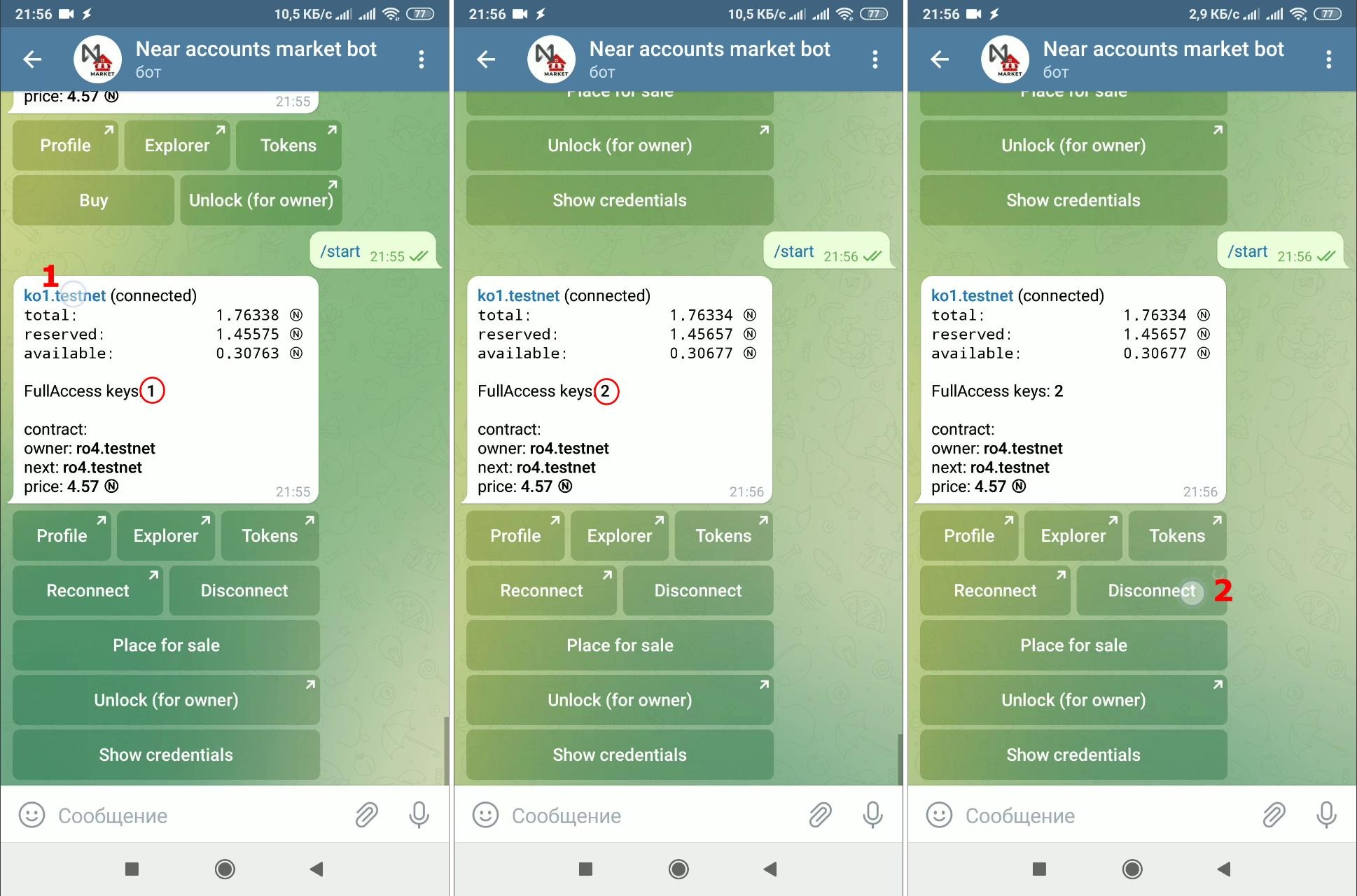 Теперь в аккаунте два ключа полного доступа, у владельца есть мнемоническая фраза и, в завершение, необходимо удалить контракт, освободить заблокированные средства и отключить бота от кошелька через кнопку "Disconnect"
