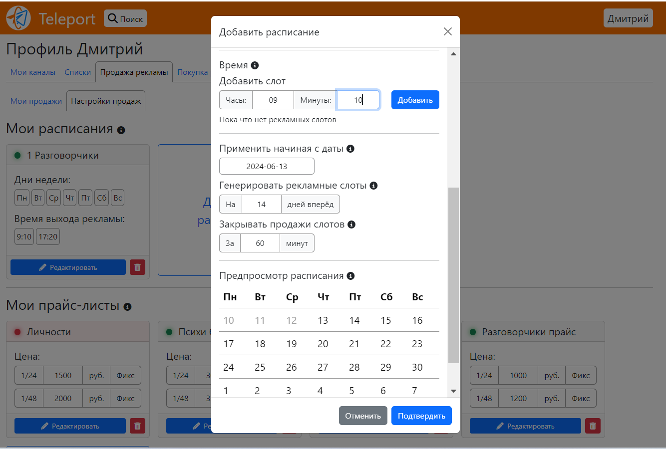 * Мои каналы из списка - это возможность установить единый формат расписания для слотов на все каналы выбранные из раздела "Списки"
