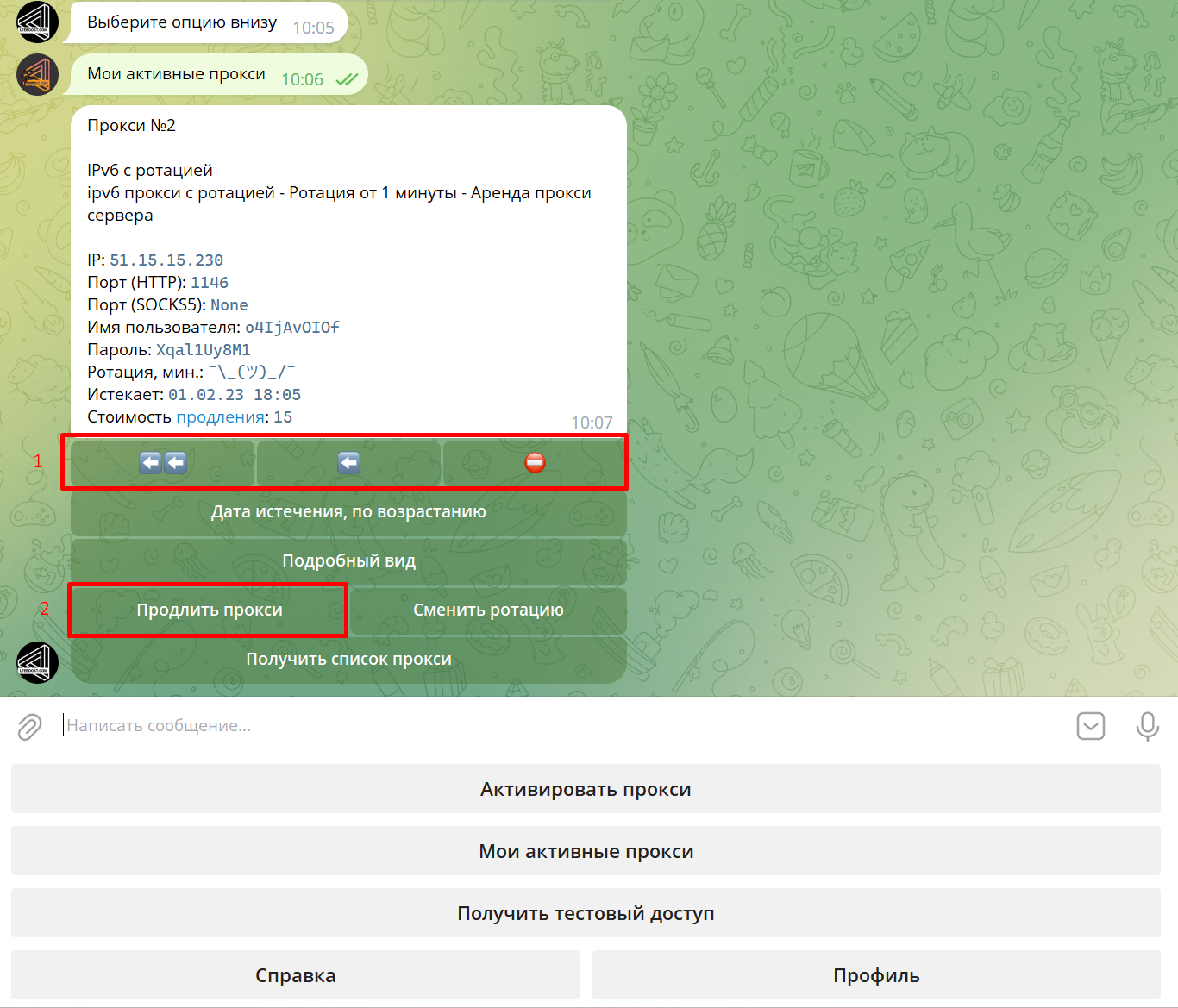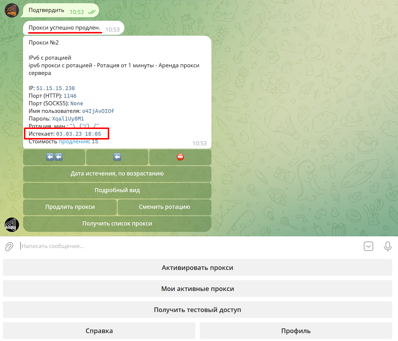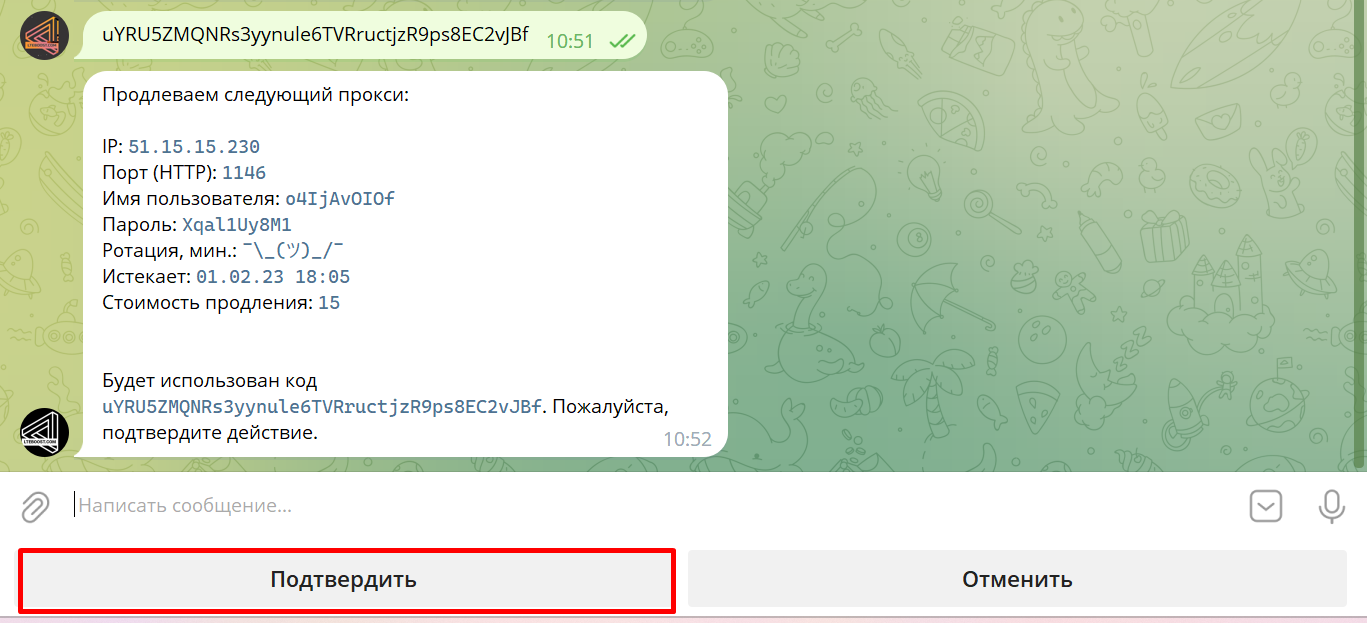 В ответ бот попросит отправить ему код продления для выбранного прокси. Вставляем код продления и отправляем боту: