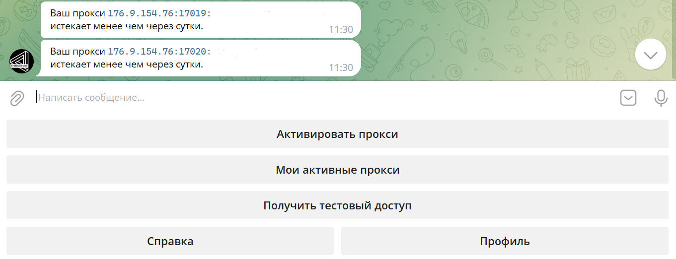 Для того, чтобы продлить ваши прокси, они должны быть активны. Если ваши прокси уже истекли, то продлить их не получится. За сутки до окончания срока аренды бот пришлет вам сообщение: