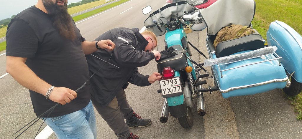 У нас ЧП — мотоцикл Игнат потерял номер. Хорошо, Алексей это увидел и остановился, а я быстро сбегал и подобрал. Мотоцикл так ничего и не понял. Вид на происходящее глазами сорвавшегося номерного знака: