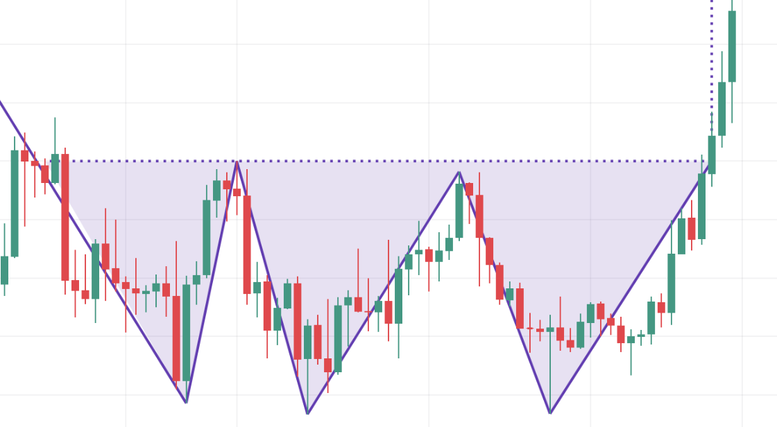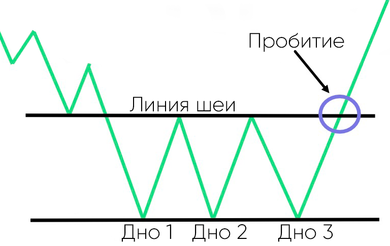 Тройное дно обычно рассматривается как три примерно равных минимума, отскакивающих от линии поддержки. Затем следует точка пробития, которая является наилучшей возможностью для входа в бычью позицию.