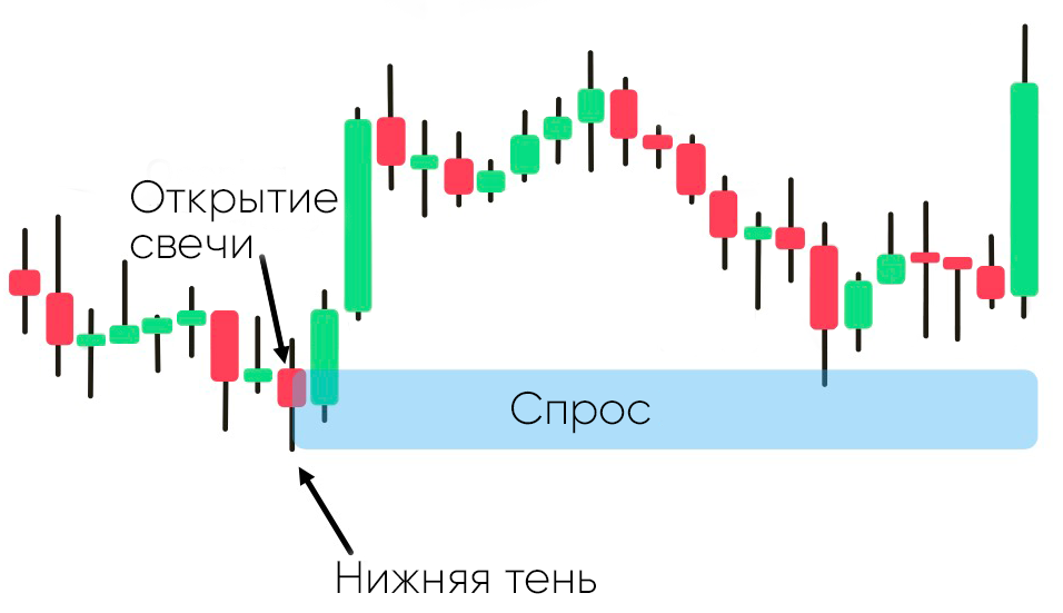 • Зоны спроса - это свечи, которые указывают на начало сильного восходящего тренда.