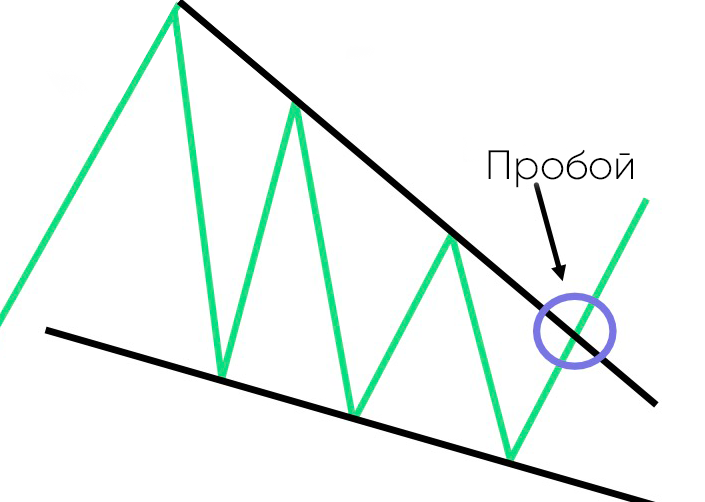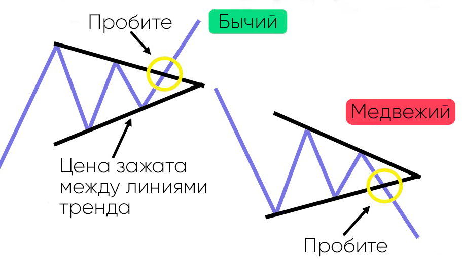 • Линии тренда начинают сходиться и в конце сжимаются, что означает, возможен бычий или медвежий тренд.