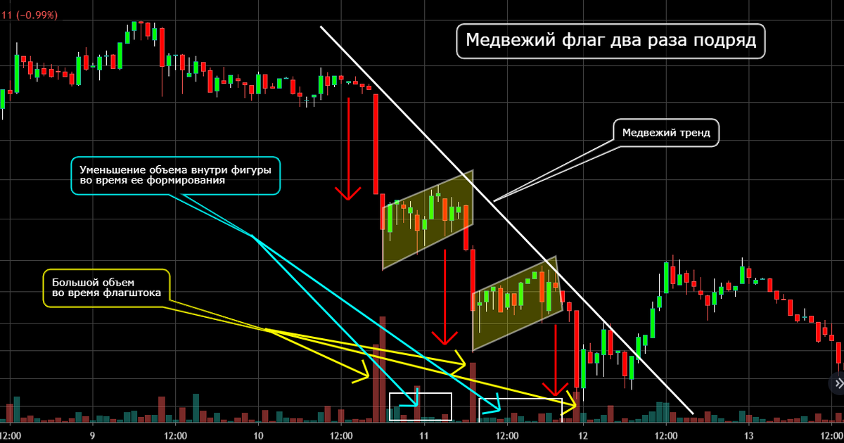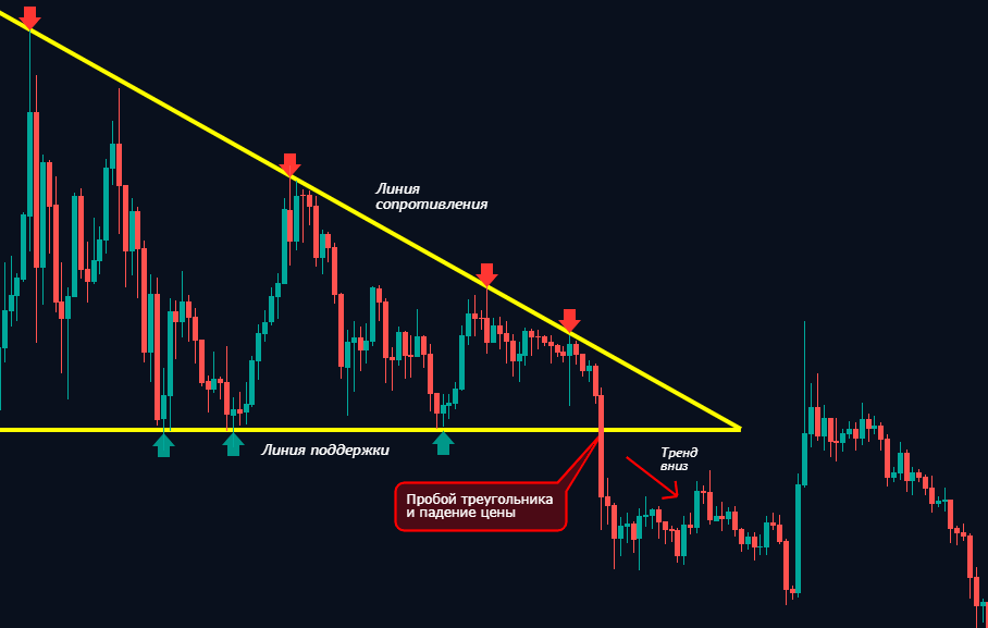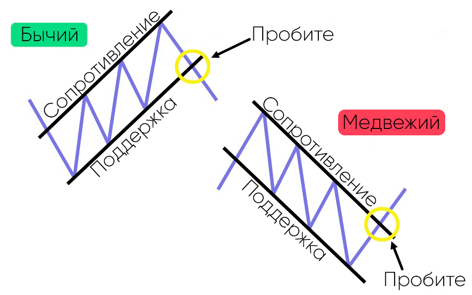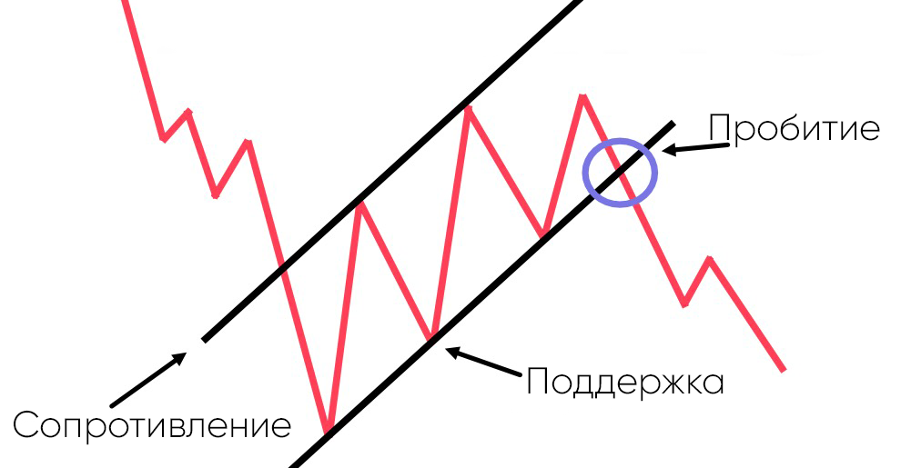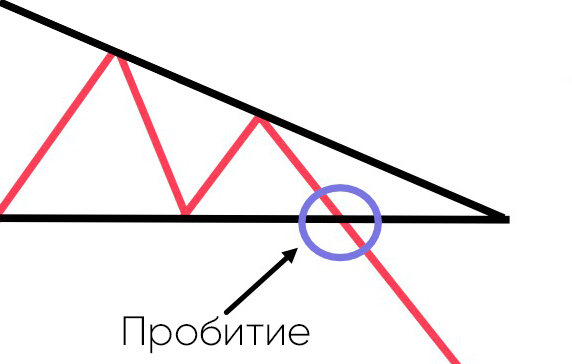 Это хорошо известный медвежий паттерн, линия поддержки расположена горизонтально, а линия сопротивления идет вдоль нисходящего тренда. Пробитие ведет к падению цены.