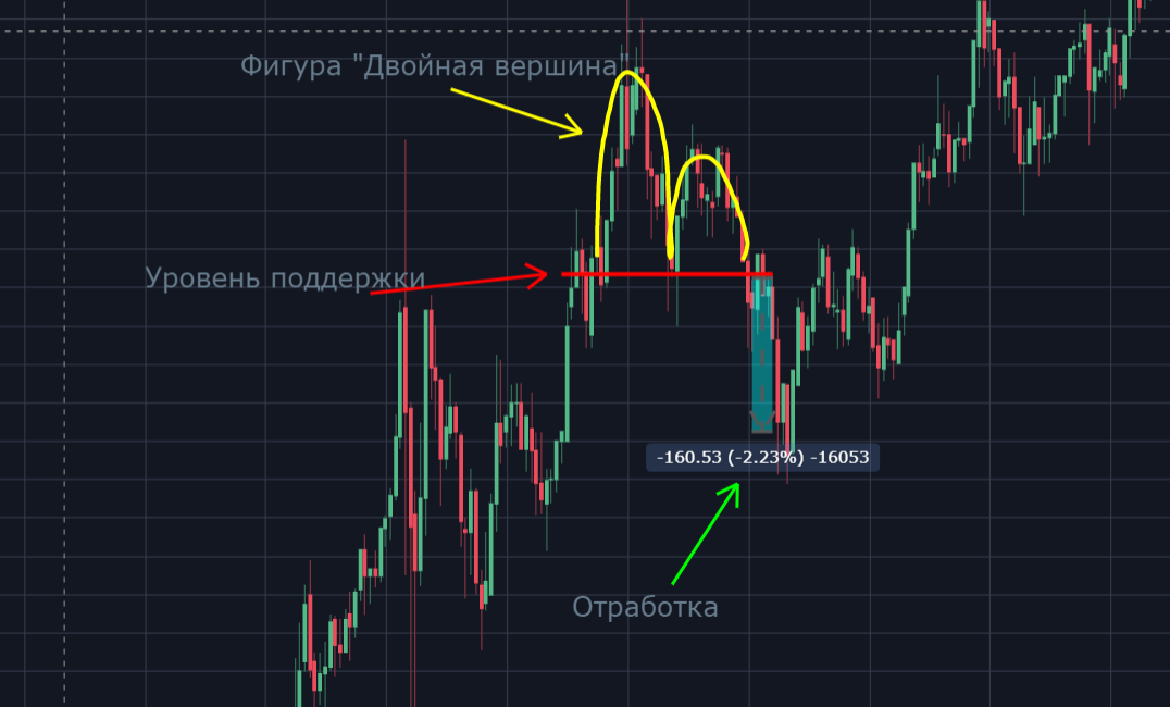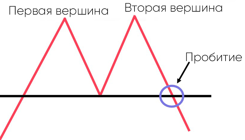 Это медвежий паттерн, который возникает после того, как цена дважды достигла максимума. И когда цена пробивает поддержку, тренд разворачивается, образуя форму "М". Это приводит к увеличению объема продаж.
