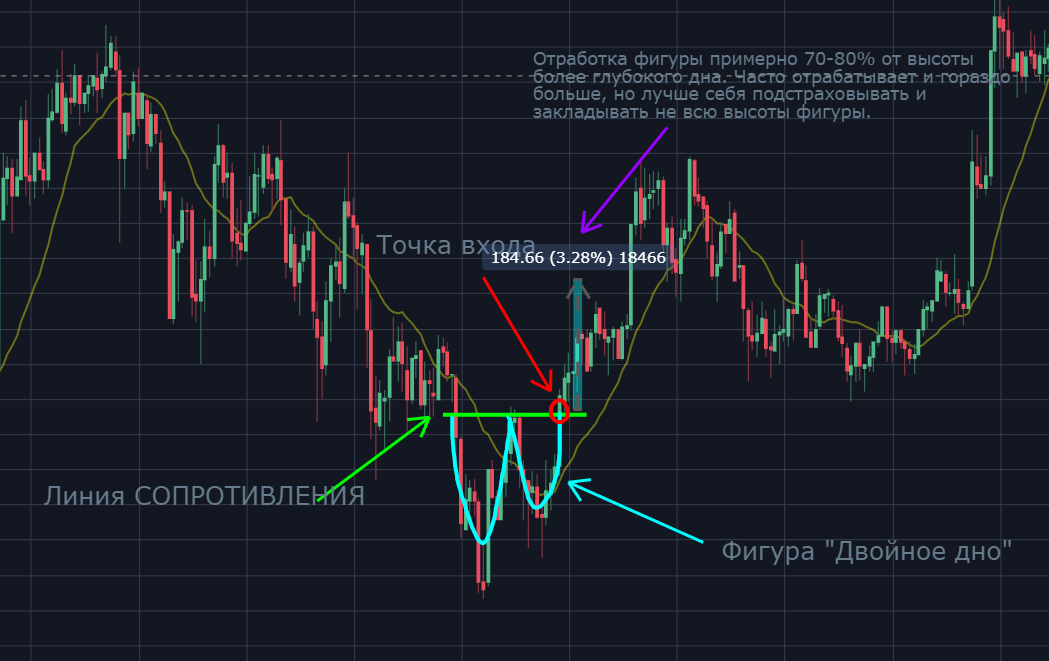 • Паттерн "двойное дно" можно увидеть на более крупных таймфреймах, таких как часовой и дневной графики.