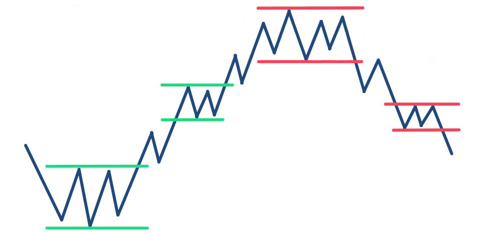 • Цена остается между этими уровнями поддержки и сопротивления до тех пор, пока они не будут пробиты. В некоторых случаях цена повторно протестирует точку пробития.