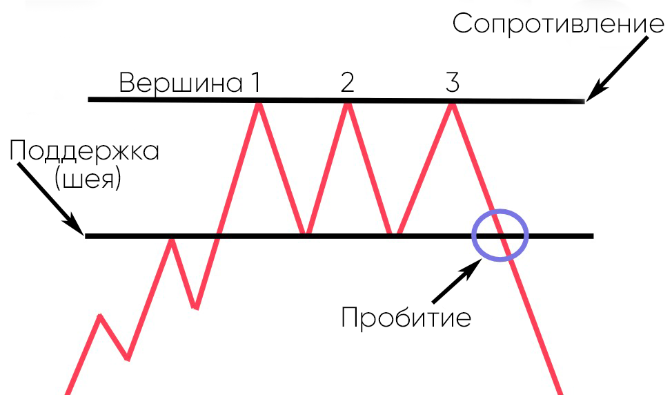 • Паттерн "тройная вершина" возникает, когда цена достигает трех максимумов на одних и тех же ценовых уровнях.
