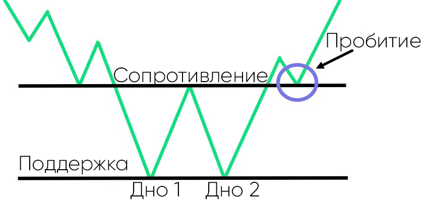 • Паттерн двойного дна напоминает букву "W".