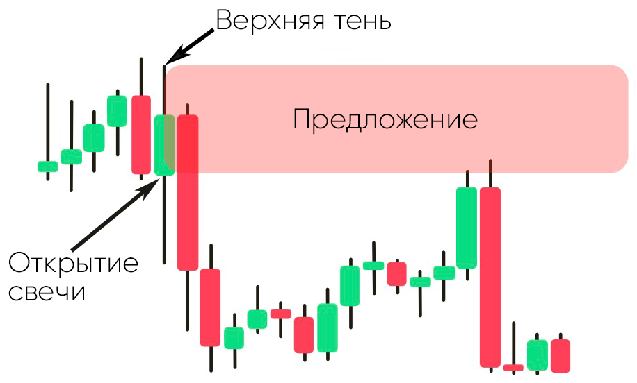 • Зоны предложения - это свечи, которые указывают на начало сильного нисходящего тренда.