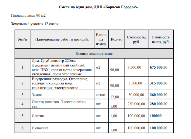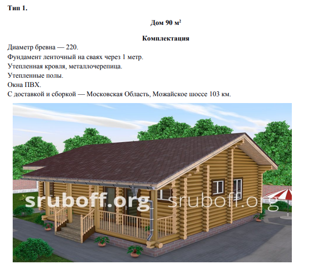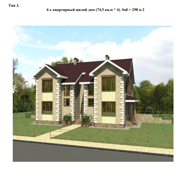 В рамках Проекта предполагается осуществить строительство жилых домов, квартиры в которых соответствуют требованиям, установленным для государственных программ. Типы жилых домов: 6.1. Малоэтажные дома из сруба общей площадью 90 кв.м., оцилиндрованные бревна из сосны и ели диаметром 220 мм. (Тип 1.); 6.2. Малоэтажные дома из сруба общей площадью 93 кв.м., оцилиндрованные бревна из сосны и ели диаметром 220 мм. (Тип 1.); 6.3. Малоэтажные блокированные четырёх квартирные жилые дома (Тип 3. Четыре 3-х комнатные квартиры по 74,5 кв.м);
