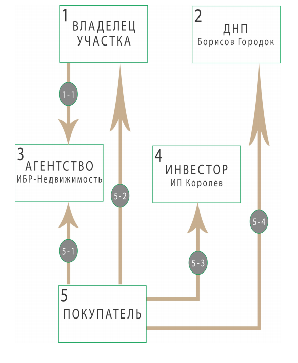 4.2. Участник №5 заключает Договор купли-продажи недвижимости с Участником №4, Договор на подключение сетей с Участником №2, Договор купли-продажи земельного участка с Участником №1 и переводит денежные средства в рамках Договоров.