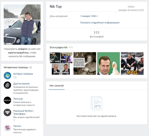 Дата регистрации аккаунта: 17.05.2014, при регистрации указал в аккаунте г. Тернополь Республика Украина. Данный пользователь, также, администрирует группы «Вконтакте» «ОmTV» (https://vk.com/omtv_vk) и «Барак Обама» (https://vk.com/barackobama_ru).