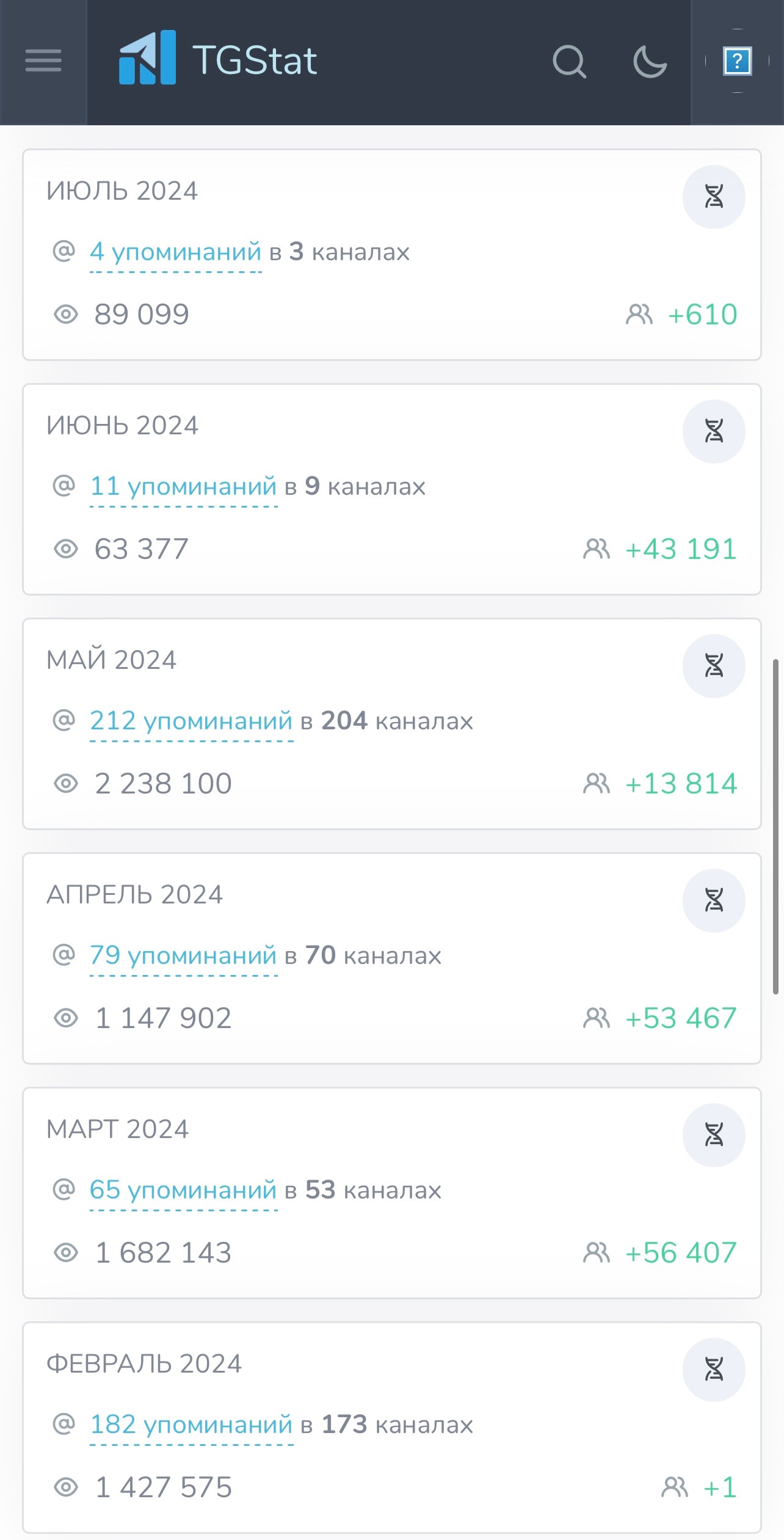 Одразу до діла перейдем. Канал розвивається з початку року, весь дохід вкладався назад, щоб проект зростав і також підключили сайт. Трафік на канал 95% з закупів в інших тг каналах, невеликий % з інст/фб/тт. Нижче прикріпляю скрін з ТгСтат по кількості згадувань в інших каналах та яке загальне охоплення реалізовано.