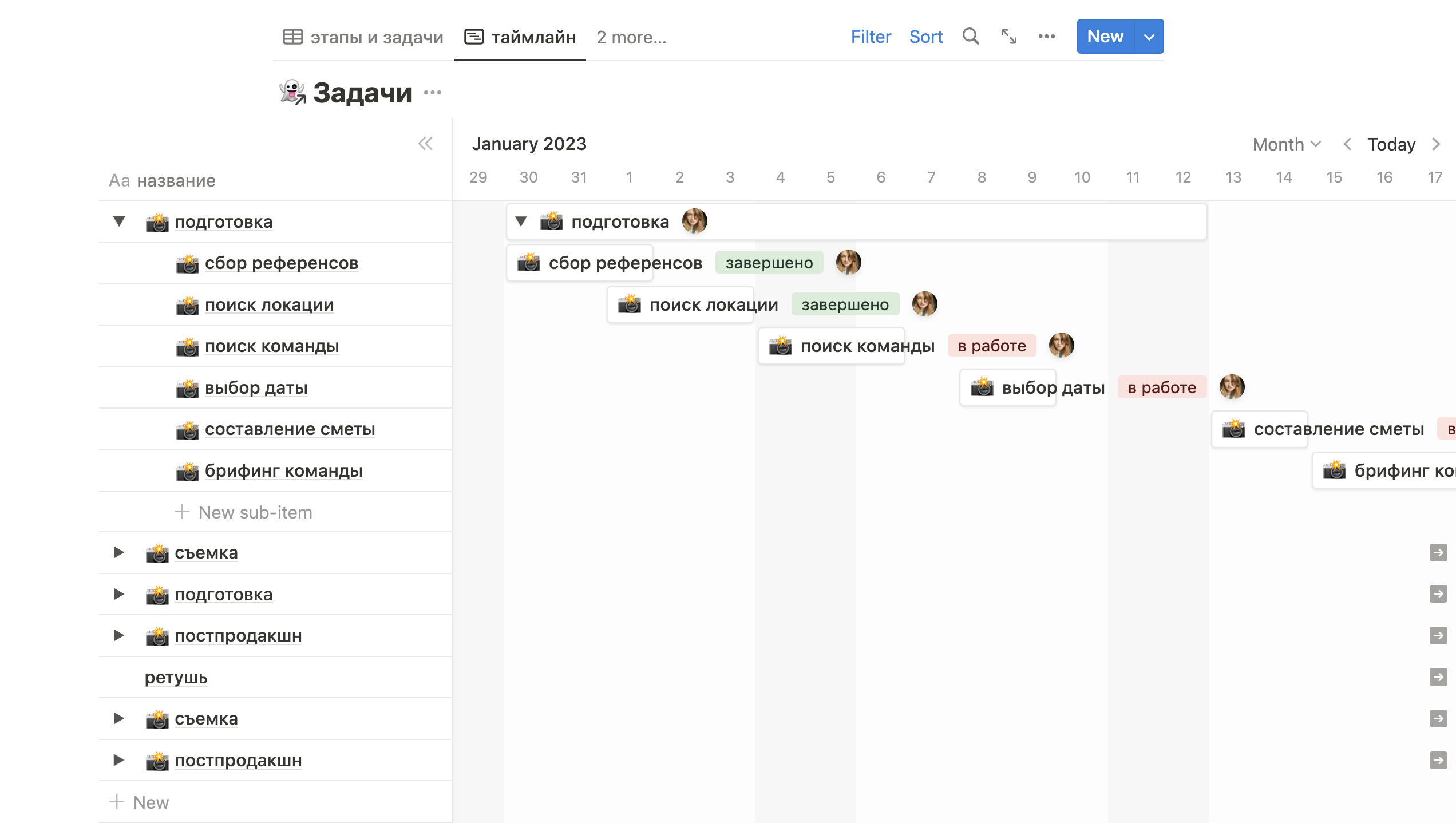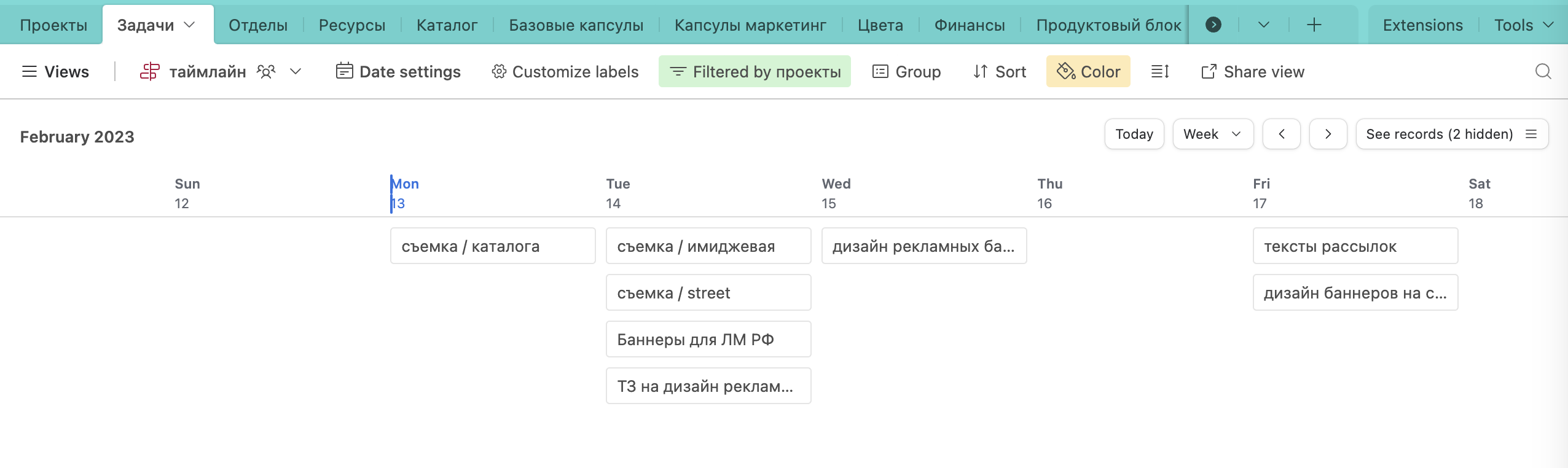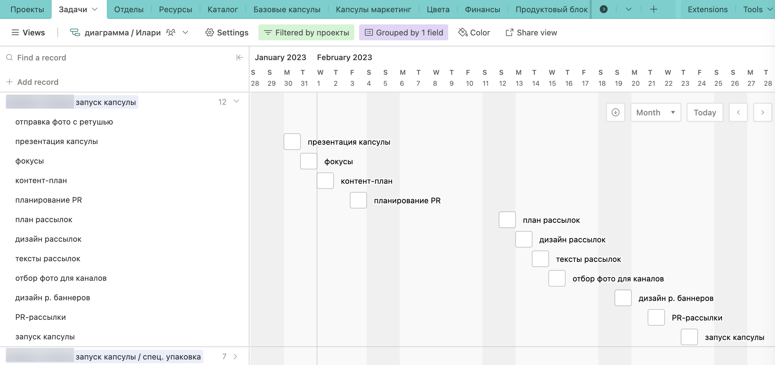 Дефолтный таймлайн в Airtable не очень удобен для использования, а вот диаграмма Ганта хороша и идентична таймлайну в Notion. Разница лишь в том, что в Notion можно кастомизировать таймлайн и выбирать какую информацию отображать (исполнитель, статус и т.д.), а в Airtable нет.