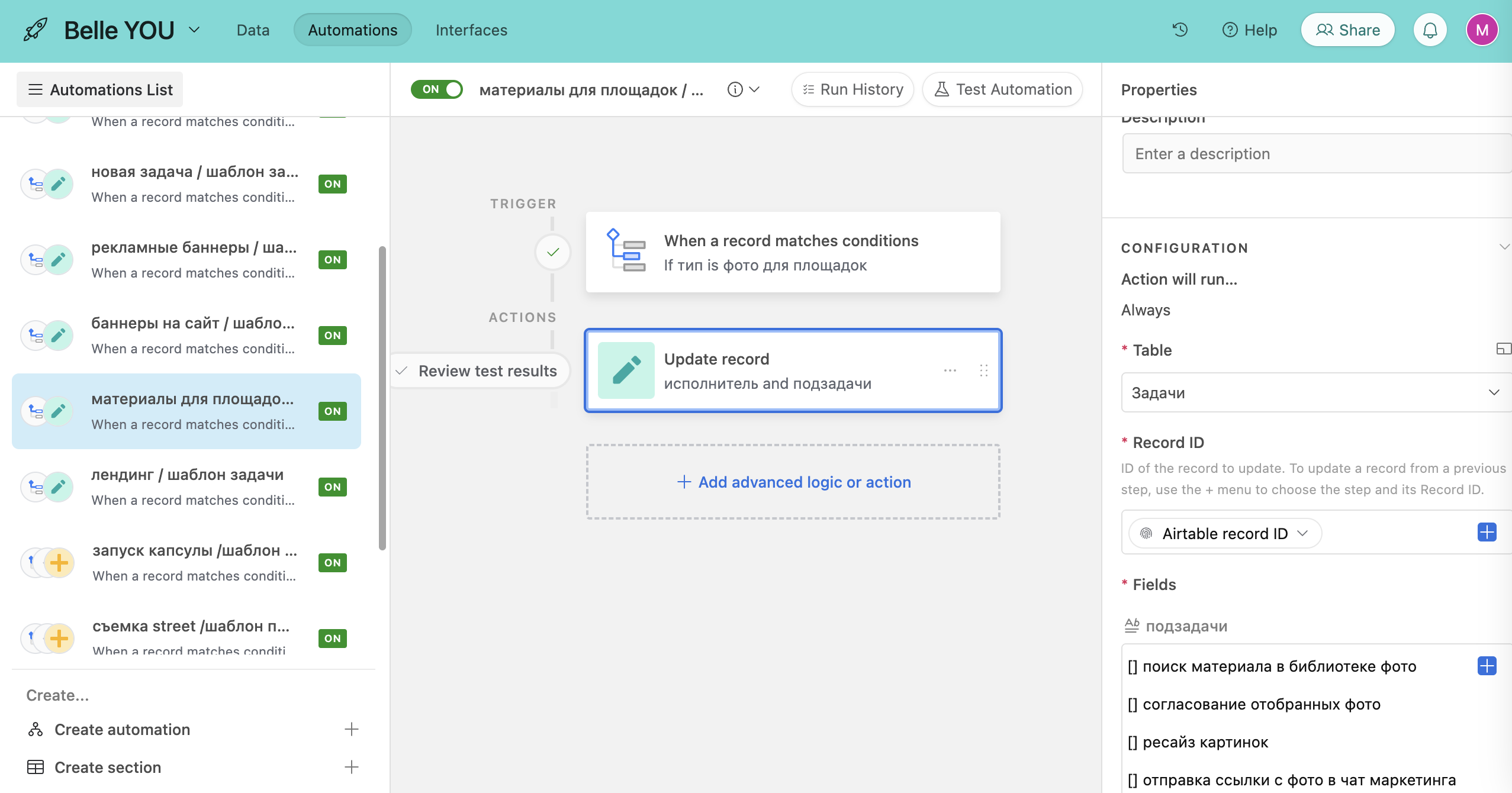 В Notion можно создать шаблон с внутренним наполнением страницы базы данных, буквально нажав пару кликов. Например, вы хотите сделать шаблон с задачей на разработку банеров, чтобы были заполнены поля с типовыми подзадачами, указаны исполнители, и т.д. Вы заходите в раздел «создать шаблон», указываете все, что вам нужно и выходите из шаблона. В Airtable это нужно делать через отдельный блок Automations, что чуть сложнее и дольше.